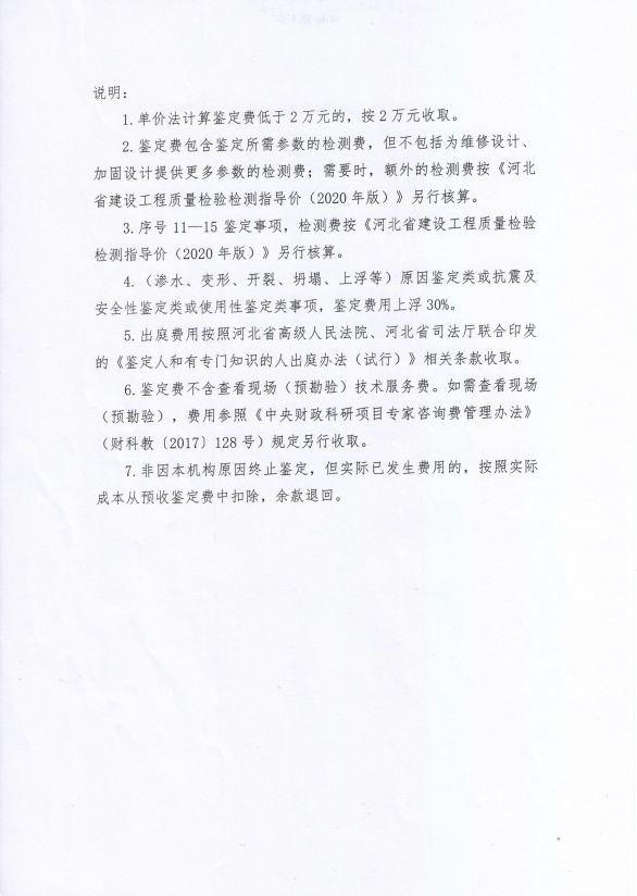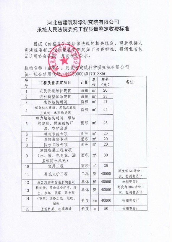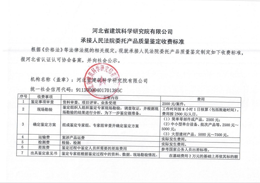 根據(jù)《河北省認(rèn)證認(rèn)可協(xié)會(huì)產(chǎn)品質(zhì)量鑒定管理辦法(試行)》第36條、《河北省認(rèn)證認(rèn)可協(xié)會(huì)工程質(zhì)量鑒定管理辦法(試行)》第35條“目前國(guó)家物價(jià)管理部門(mén)未對(duì)工程質(zhì)量鑒定收費(fèi)進(jìn)行統(tǒng)一定價(jià),鑒定機(jī)構(gòu)應(yīng)當(dāng)公示本機(jī)構(gòu)收費(fèi)標(biāo)準(zhǔn)”之規(guī)定,我公司參照財(cái)政部財(cái)科教【2017】128號(hào)《中央財(cái)政科研項(xiàng)目專(zhuān)家咨詢(xún)費(fèi)管理辦法》中的有關(guān)規(guī)定,并結(jié)合我公司產(chǎn)品質(zhì)量鑒定和工程質(zhì)量鑒定中鑒定專(zhuān)家工作的實(shí)際情況,制定了《河北省建筑科學(xué)研究院有限公司產(chǎn)品質(zhì)量鑒定/工程質(zhì)量鑒定收費(fèi)標(biāo)準(zhǔn)》(見(jiàn)附件)?,F(xiàn)予以公示。